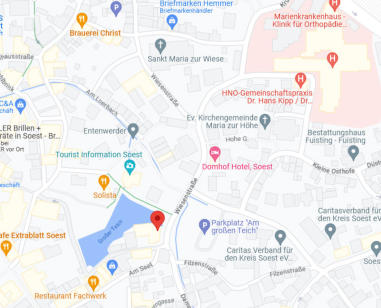 Im Herzen von Soest, direkt am Großen Teich gelegen,befinden sich die Praxisräume über dem Salon Lui&Lei, Eingang rechts vom Salon direkt am Teich.Die Anfahrt erfolgt am Besten von der Wallstraße aus; von dort ist es die Zufahrt direkt hinter dem Marienkrankenhaus bzw. der Liegendeinfahrt des Marienkrankenhauses.Parkmöglichkeiten sind direkt gegenüber der Praxis auf dem großen Parkplatz (ehemaliges Hallenbad).Im Haus ist ein Aufzug, der Sie in den ersten Stock bringt. Allerdings ist vor dem Aufzug eine kleine Treppe mit 3 Stufen zu überwinden. Rollschienen für Rollstühle sind im Treppenhaus vorhanden.